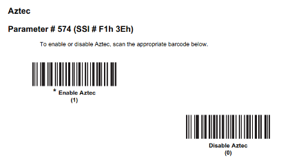 Solution: Use the barcodes below to enable or disable Aztec codes.